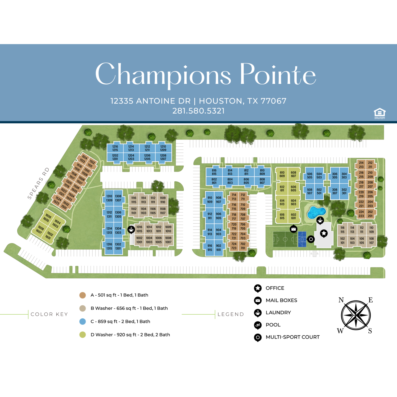 Select a floor plan or bedroom count to view those units on the overhead view on the site map. If you need assistance finding a unit in a specific location please call us at 281-580-5321 TTY: 711.